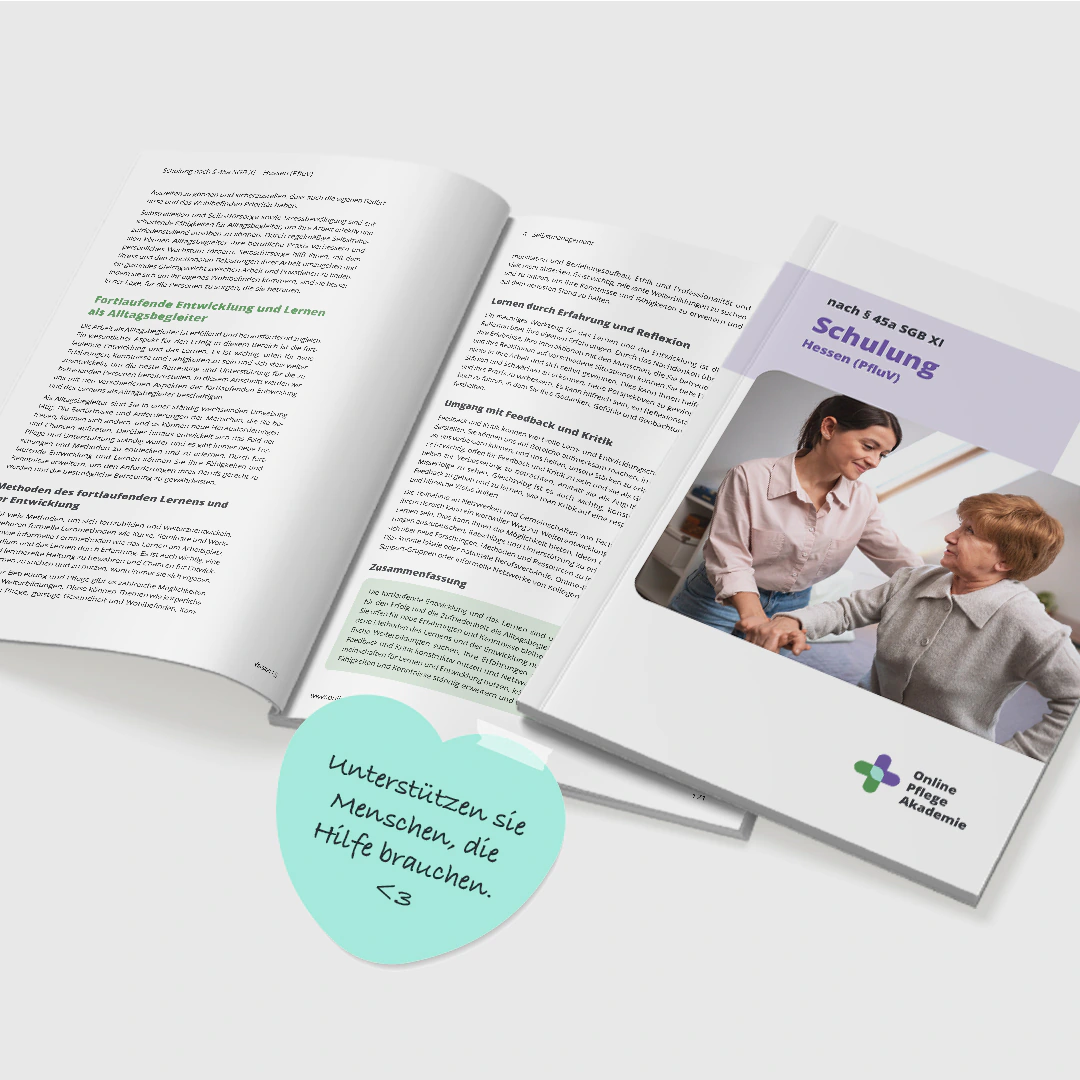 Unsere Schulung umfasst alle Pflichtinhalte nach § 45a SGB XI (PfluV Hessen). Sie absolvieren die Basisqualifikation mit 30 Unterrichtseinheiten.
